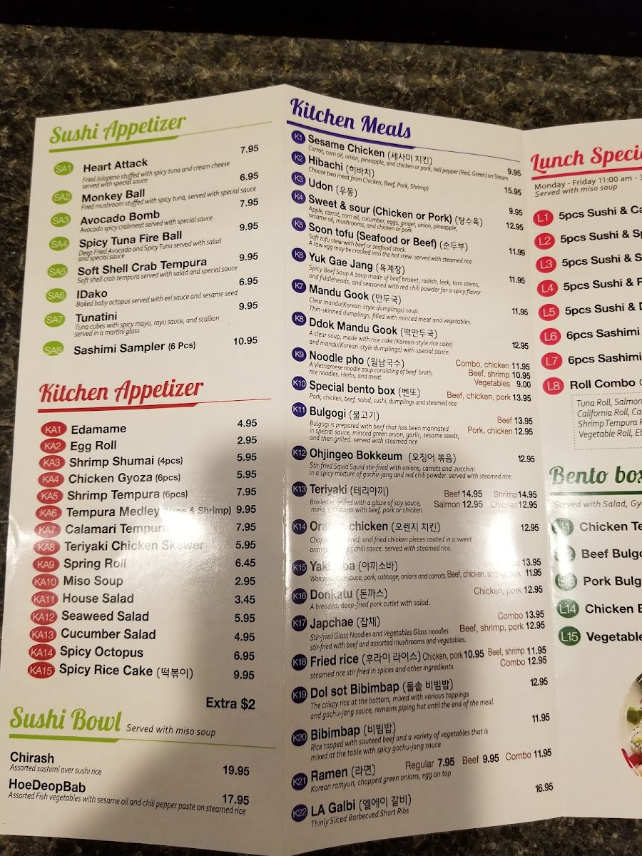 Beef, chicken, or pork, ginger salad, sushi, dumplings and steamed rice.